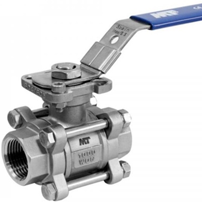 Válvula de bola de 3 piezas con conexión roscada Hembra-Hembra, paso total con palanca de color azul y pletina de montaje directo de acuerdo a ISO 5211.